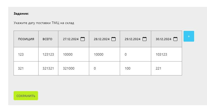 На заводе требовалась возможность фиксировать даты поставки деталей прямо в задаче. Для этого нами была реализована таблица: при нажатии на «плюс» добавляется колонка с текущим числом, а в строках перечислены наименования деталей, привязанных к сделке. Под каждой датой указывается количество поступивших единиц, а слева отображается общий доступный остаток — превысить его невозможно, автоматика не пропустит некорректный ввод.