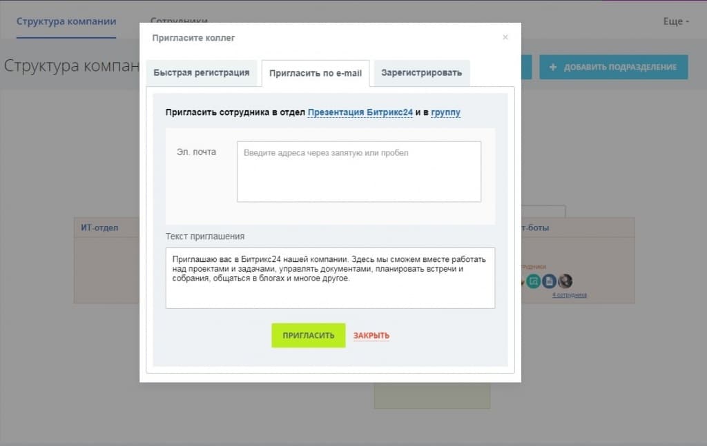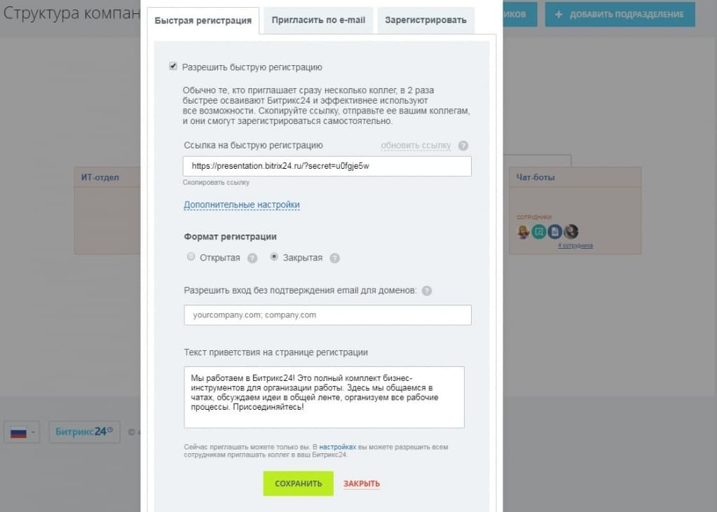 - Быстрая регистрация - просто разошлите ссылку на быструю регистрацию всем своим сотрудникам любым удобным способом. Перейдя по этой ссылке, они смогут зарегистрироваться на вашем портале. Формат открытой регистрации сразу добавляет всех зарегистрировавшихся в сотрудники. Закрытая регистрация предполагает подтверждение каждого добавляемого пользователя администратором портала.