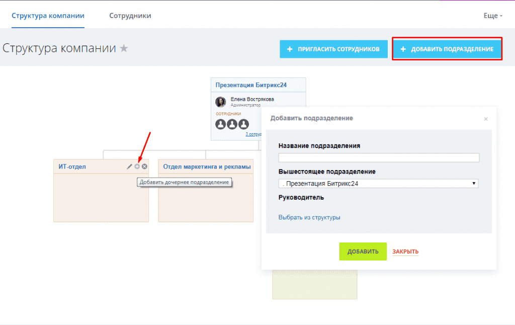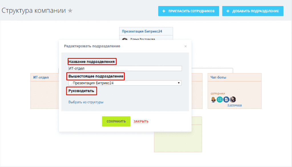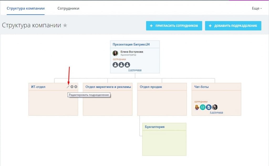 - Редактировать (изменить название, местоположение отдела в иерархии компании, назначить руководителя подразделения)