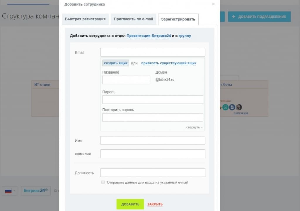 - Регистрация сотрудника. Здесь можно сразу зарегистрировать корпоративный почтовый адрес для сотрудника или указать уже существующий рабочий. Можно указать все данные сотрудника, а также задать пароль для входа, который сотрудник сможет потом самостоятельно поменять.
