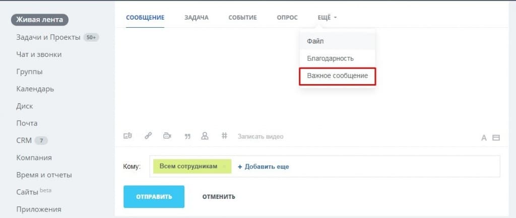 Чтобы разместить в Живой ленте сообщение, прочтение которого сотрудники должны будут подтвердить, выберите тип сообщения "Важное сообщение". После публикации сообщения у него появится кнопка "Прочитано", которую необходимо нажать для подтверждения прочтения. Система фиксирует количество сотрудников, которые прочитали это сообщение.
