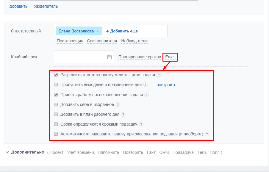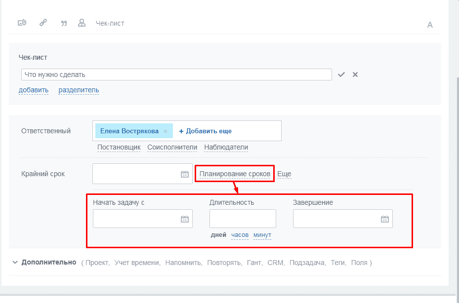 Планирование сроков (нужно заполнять, иначе задача не будет отображаться в разделе “Занятость”).