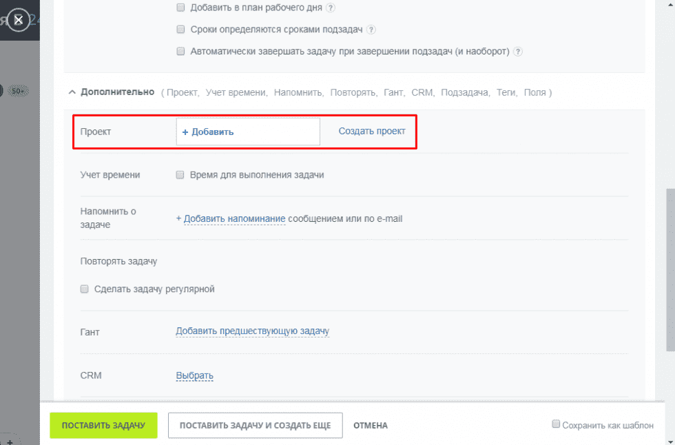 Указать привязку к проекту (в задачах проекта эта задача появится).