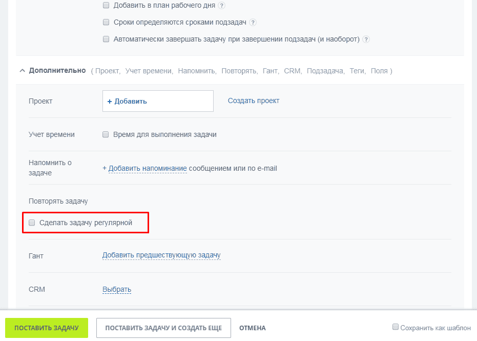 Указать время выполнения (если галочку “Учет времени” не включить, то время по данной задаче считаться не будет).