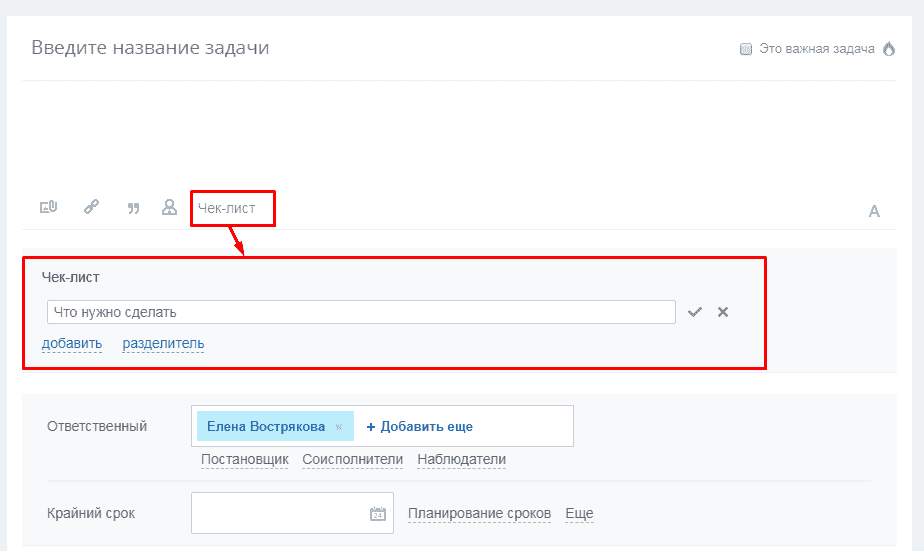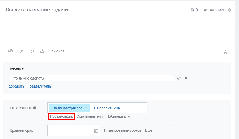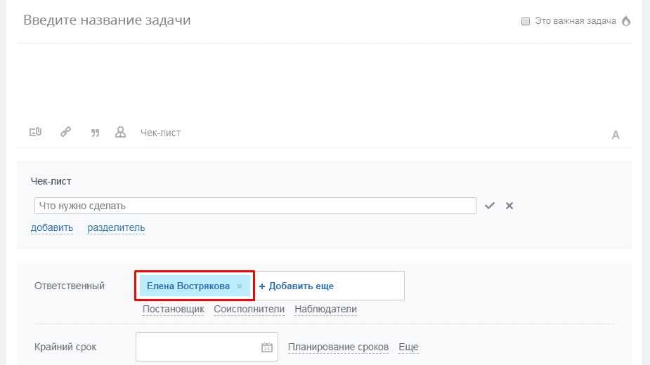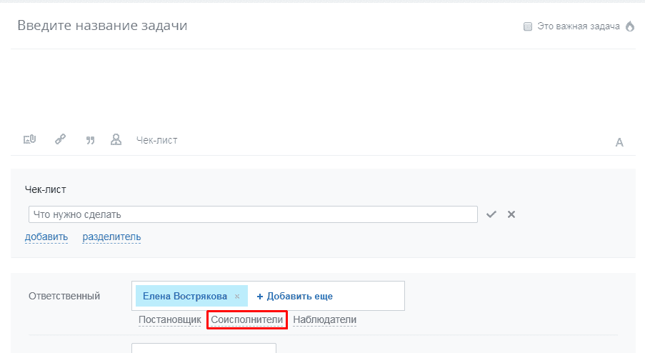 Назначить соисполнителя. Если нужны помощники, то можно выбрать несколько соисполнителей: они будут принимать участие в задаче.